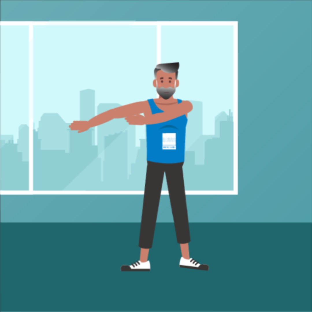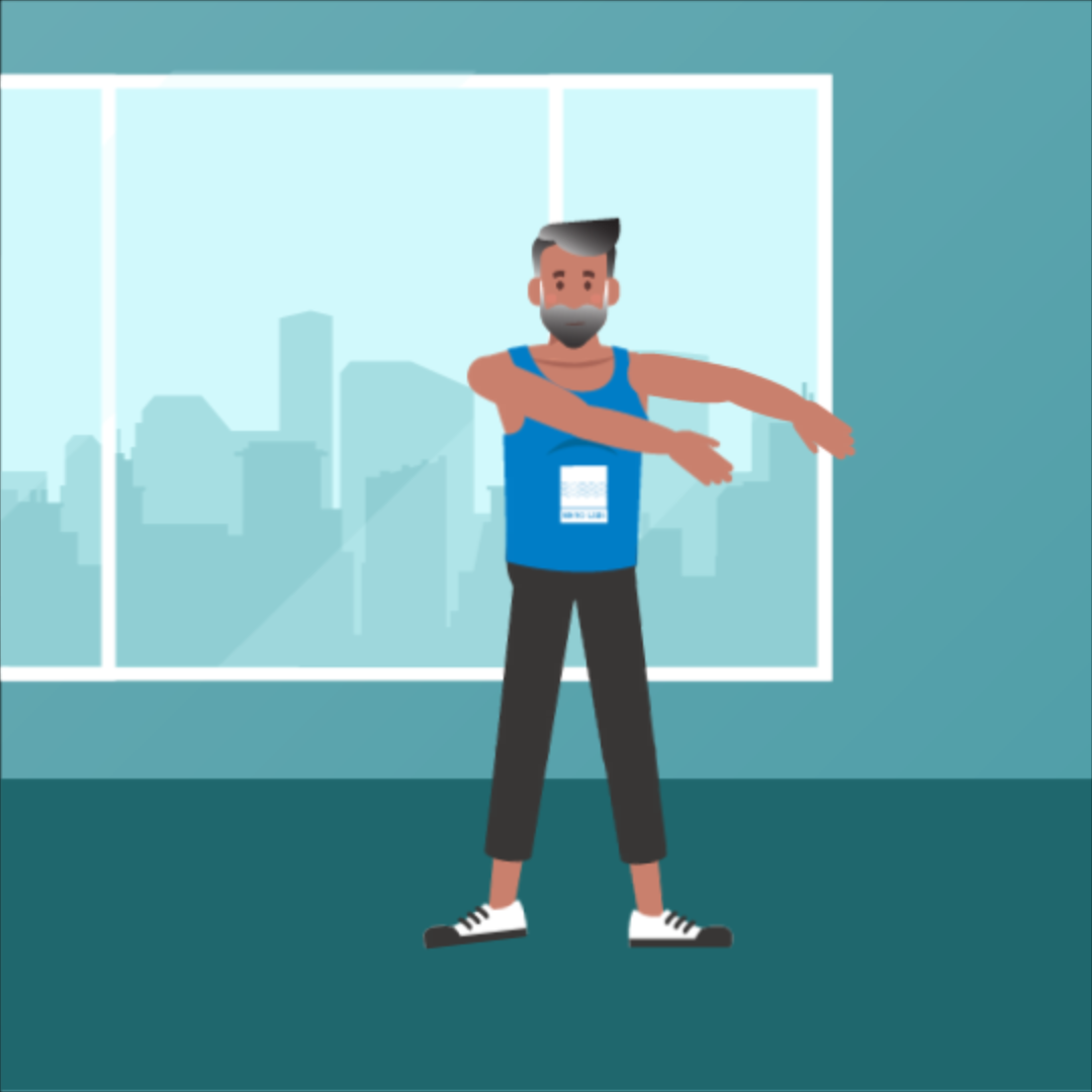 Schwingen Sie Ihre Arme soweit es geht nach links und drehen Sie Ihren Oberkörper und Kopf mit. Die rechte Ferse wird leicht angehoben. Wiederholen Sie die Übung auf der anderen Seite.