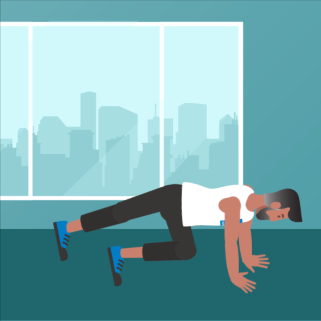 Mit der Einatmung ziehen Sie das rechte Knie zum Oberkörper heran und strecken dabei die Zehenspitzen nach hinten aus. Strecken Sie mit der Ausatmung das rechte Bein wieder nach hinten aus. Wiederholen Sie die Bewegung mit dem anderen Bein.