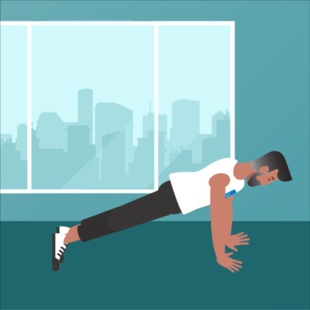 Stellen Sie den rechten Arm so auf, dass Ihre Hand den Körper nach oben drückt. Ziehen Sie den linken Arm nach, um in die Liegestützposition kommen. Gehen Sie danach wieder zurück in die Unterarmstützposition.